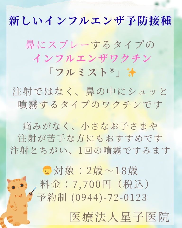 当院では、従来の注射タイプに加えて鼻の中にスプレーするタイプのワクチン「フルミスト®」も導入しております。