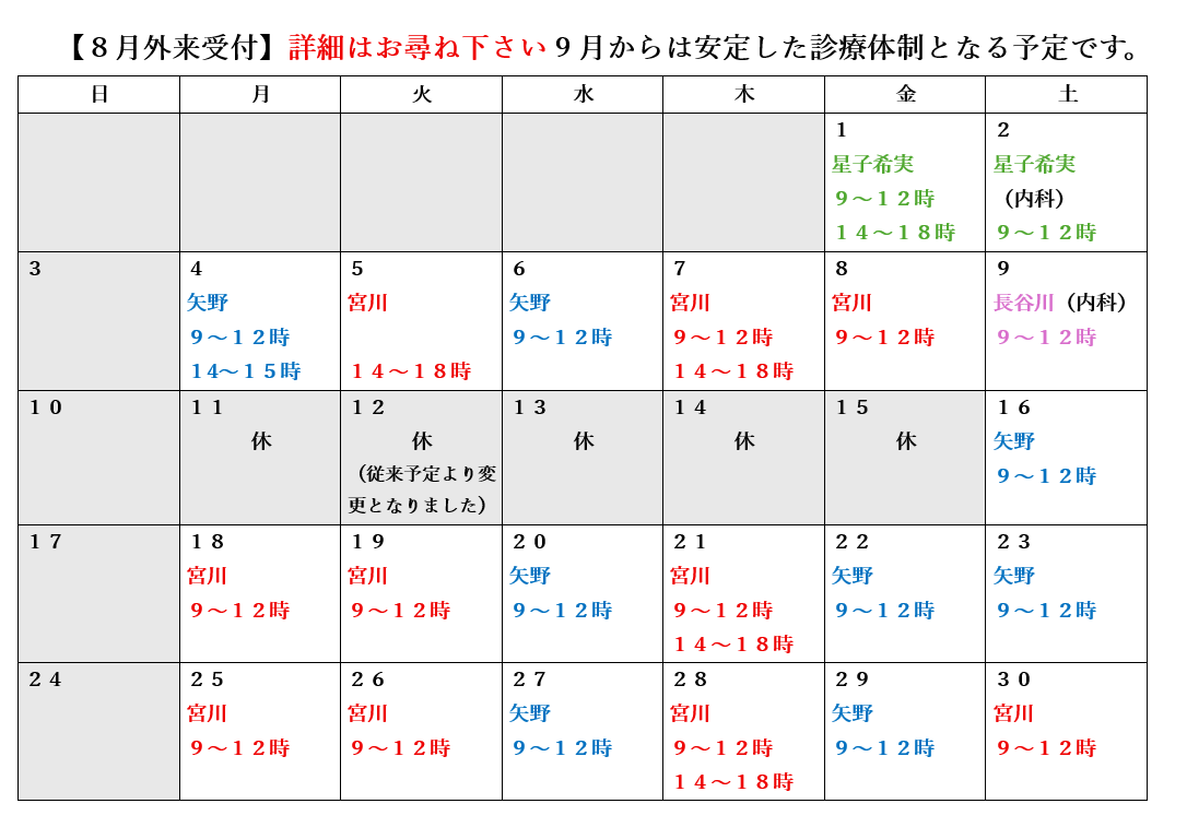 8月は以下の予定で診療いたします。